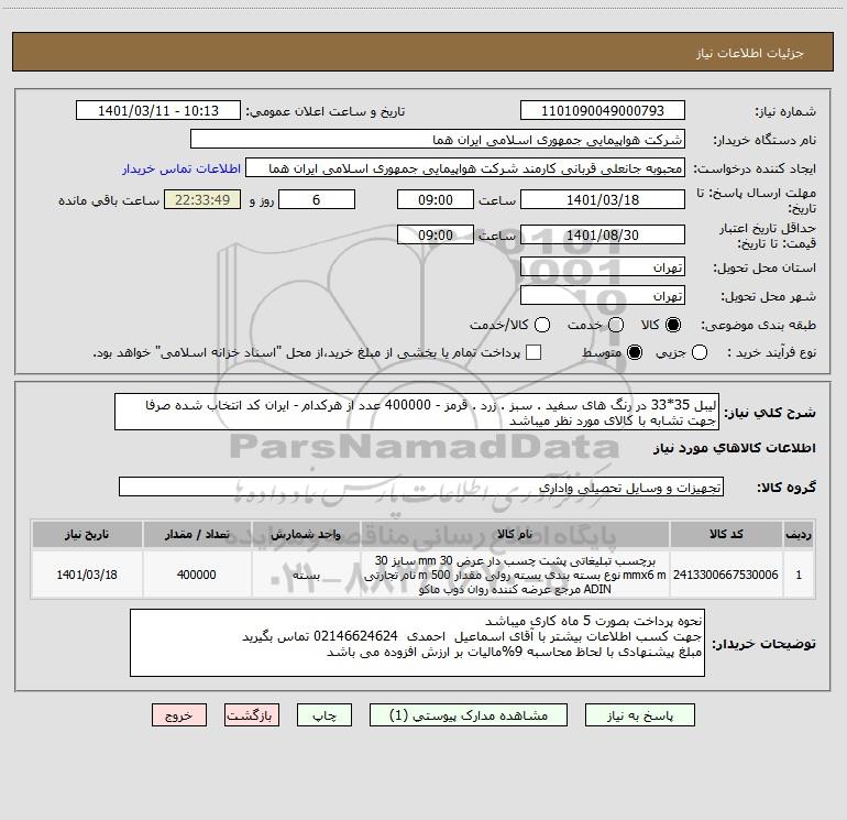 شرح کلی نیاز: لیبل 35*33 در رنگ های سفید . سبز . زرد . قرمز - 400000 عدد از هرکدام - ایران کد انتخاب شده صرفا جهت تشابه با کالای مورد نظر میباشد