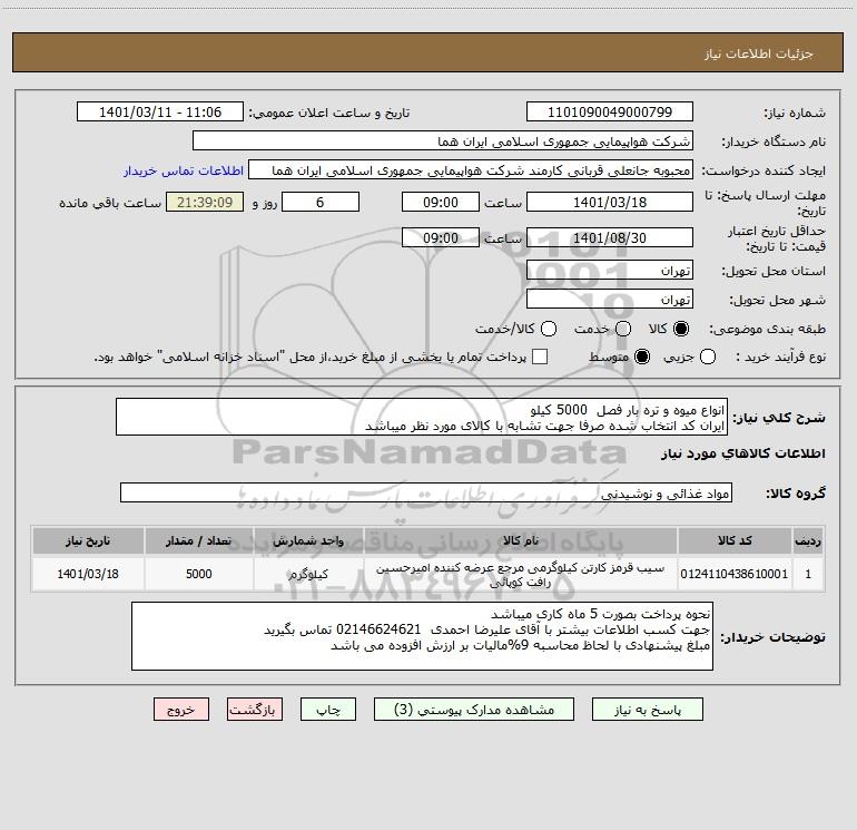 شرح کلی نیاز: انواع میوه و تره بار فصل 5000 کیلو