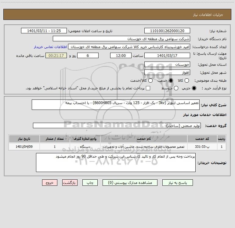 استعلام تعمیر اساسی اینورتر (3kv - بک افزار - 125 ولت - سریال 86004805) - با احتساب بیمه, استعلام تعمیر اساسی اینورتر (3kv - بک افزار - 125 ولت - سریال 86004805) - با احتساب بیمه