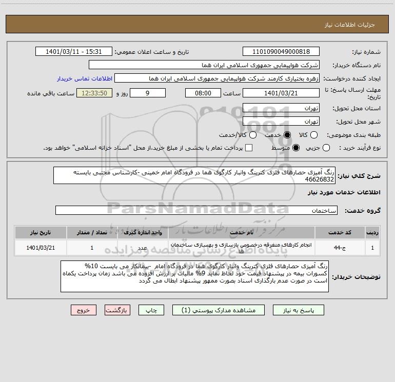 استعلام رنگ آمیزی حصارهای فلزی کترینگ وانبار کارگوی هما در فرودگاه امام خمینی -کارشناس مجتبی بایسته 46626832, استعلام رنگ آمیزی حصارهای فلزی کترینگ وانبار کارگوی هما در فرودگاه امام خمینی -کارشناس مجتبی بایسته 46626832