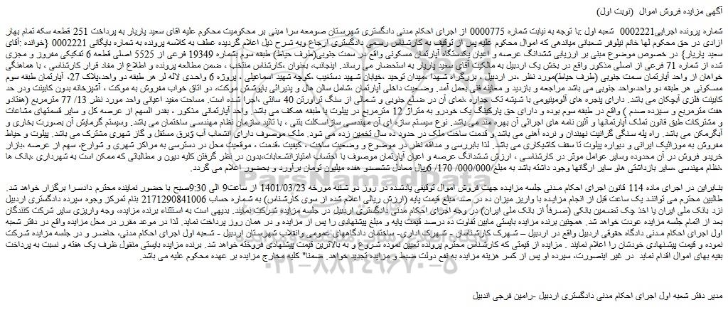 شماره پرونده اجرایی0002221 شعبه اول :با توجه به نیابت شماره 0000775 از اجرای احکام مدنی دادگستری شهرستان صومعه سرا مبنی بر محکومیت محکوم علیه اقای سعید پاریار به پرداخت 251 قطعه سکه تمام بهار ازادی در حق محکوم لها خانم نیلوفر شعبانی میاندهی که اموال محکوم علیه پس از توقیف به کارشناس رسمی دادگستری ارجاع وبه شرح ذیل اعلام گردیده عطف به کلاسه پرونده به شماره بایگانی 0002221 {خوانده :آقای سعید پاریار} در خصوص موضوع مبنی بر ارزیابی ششدانگ عرصه و اعیان یکدستگاه آپارتمان مسکونی واقع در سمت جنوبی(طرف حیاط) طبقه سوم بشماره 19349 فرعی از 5525 اصلی قطعه 6 تفکیکی مفروز و مجزی شده از شماره 71 فرعی از اصلی مذکور واقع در بخش یک اردبیل به مالکیت آقای سعید پاریار به استحضار می رساند. اینجانب، بعنوان ،کارشناس منتخب ، ضمن مطالعه پرونده و اطلاع از مفاد قرار کارشناسی ، با هماهنگی خواهان از واحد آپارتمان سمت جنوبی (طرف حیاط)مورد نظر ،در اردبیل ، بزرگراه شهدا ،میدان توحید ،خیابان شهید دستغیب ،کوچه شهید اسماعیلی ، پروژه 6 واحدی لاله لر هر طبقه دو واحد،پلاک 27، آپارتمان طبقه سوم مسکونی هر طبقه دو واحد،واحد جنوبی می باشد مراجعه و بازدید و معاینه فنی بعمل آمد. وضعیت داخلی آپارتمان ،شامل سالن هال و پذیرائی باپوشش موکت، دو اتاق خواب مفروش به موکت ، آشپزخانه بدون کابینت ودر حد کابینت فلزی آبچکان می باشد. دارای پنجره های آلومینیومی با شیشه تک جداره ،نمای آن در ضلع جنوبی و شمالی از سنگ تراورتن 40 سانتی ،اجرا شده است. مساحت مفید اعیانی واحد مورد نظر 13/ 77 مترمربع (هفتادو هفت مترمربع و سیزده صدم ) واقع در طبقه سوم بوده و دارای حق پارکینگ یک خودرو به متراژ 12 مترمربع در پیلوت یا طبقه همکف می باشد. واحد آپارتمانی مذکور ، بقدر السهم از عرصه کل و سایر قسمتهای مشاعات و مشترکات طبق قانون تملک آپارتمانها و آئین نامه های اجرائی آن بهره مند می باشد. نوع سیستم سازه ای آن مهندسی سازاسکلت بتنی ، با تائید سازمان نظام مهندسی ساختمان می باشد. وسیستم گرمایش آن بصورت بخاری و آبگرمکن می باشد. راه پله سنگی گرانیت نهبندان و نرده آهنی می باشد.و قدمت ساخت ملک در حدود ده سال تخمین زده می شود. ملک موصوف دارای انشعاب آب وّبرق مستقل و گاز شهری مشترک می باشد. پیلوت و حیاط مفروش به موزائیک ایرانی و دیواره پیلوت تا سقف کاشیکاری می باشد. لذا بابررسی و مداقه نظر در موضوع و وضعیت ساخت ، کیفیت ،قدمت ، موقعیت محل در دسترسی به مراکز شهری و شوارع، سهم از عرصه ،بازار خریدو فروش در آن محدوده وسایر عوامل موثر در کارشناسی ، ارزش ششدانگ عرصه و اعیان آپارتمان موصوف با احتساب امتیازانشعابات،بدون در نظر گرفتن کلیه دیون و مطالباتی که ممکن است به شهرداری ،بانک ها ،نظام مهندسی ،سایر بازداشتی هاو سایر ارگانها وجود داشته باشد به مبلغ/000/000/ 170/ 6ریال معادل ششصدو هفده میلیون تومان برآورد و بحضور اعلام می گردد.