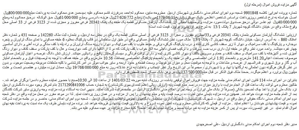 شماره پرونده اجرایی: کلاسه 9901848 شعبه دوم اجرای احکام مدنی دادگستری شهرستان اردبیل مطروحه مابین، محکوم له:احمد بدرفرزند قاسم محکوم علیه :سیدحسن هدی محکوم است به پرداخت مبلغ800/000/000ریال اصل خواسته به نرخ شاخص روزپرداخت براساس شاخص اعلامی بانک مرکزی(تاریخ1379/06/15می باشد) ومبلغ 27/626/772ریال هزینه دادرسی ومبلغ 61/000/000ریال حق الوکاله درحق محکوم له ومبلغ 40/000/000ریال نیم عشر دولتی درحق صندوق دولت،مورد مزایده و توصیف اجمالی آن: ششدانگ آپارتمان مسکونی قطعه یک طبقه یک پلاک 20341 فرعی مفروز و مجزی شده از 3123 فرعی از 33 اصلی محل وقوع ملک واقع در خیابان دانشگاه کوچه شهریار 7 پلاک 13/1 به شرح زیر ارزیابی و برآورد قیمت شده است؛