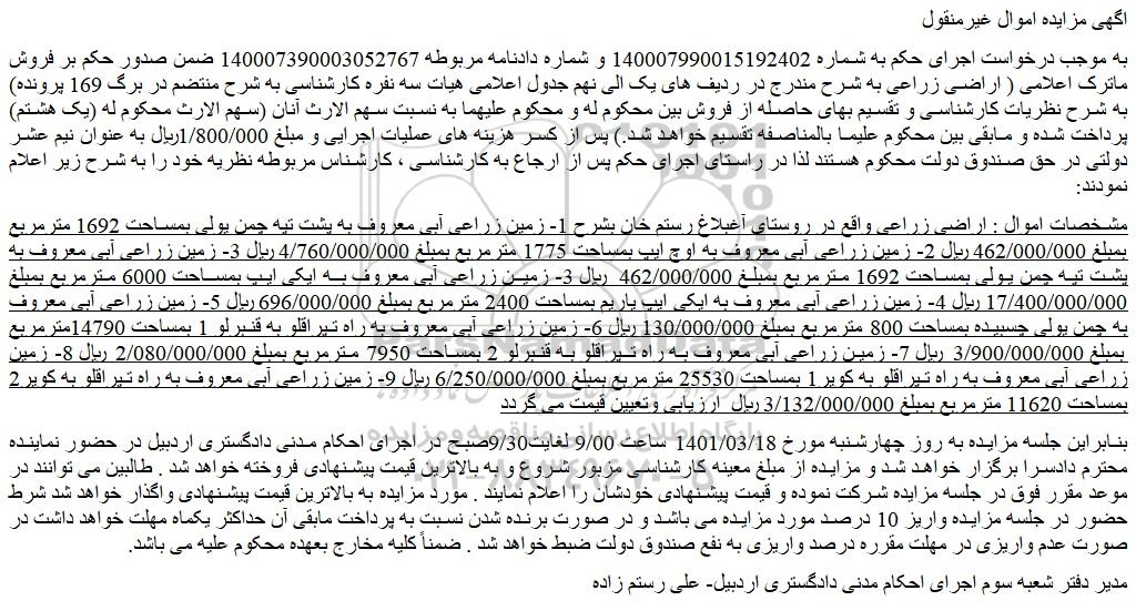 مشخصات اموال : اراضی زراعی واقع در روستای آغبلاغ رستم خان بشرح 1- زمین زراعی آبی معروف به پشت تپه چمن یولی بمساحت 1692 مترمربع بمبلغ 462/000/000 ریال 2- زمین زراعی آبی معروف به اوچ ایپ بمساحت 1775 مترمربع بمبلغ 4/760/000/000 ریال 3- زمین زراعی آبی معروف به پشت تپه چمن یولی بمساحت 1692 مترمربع بمبلغ 462/000/000 ریال 3- زمین زراعی آبی معروف به ایکی ایپ بمساحت 6000 مترمربع بمبلغ 17/400/000/000 ریال 4- زمین زراعی آبی معروف به ایکی ایپ یاریم بمساحت 2400 مترمربع بمبلغ 696/000/000 ریال 5- زمین زراعی آبی معروف به چمن یولی چسبیده بمساحت 800 مترمربع بمبلغ 130/000/000 ریال 6- زمین زراعی آبی معروف به راه تپراقلو به قنبرلو 1 بمساحت 14790مترمربع بمبلغ 3/900/000/000 ریال 7- زمین زراعی آبی معروف به راه تپراقلو به قنبرلو 2 بمساحت 7950 مترمربع بمبلغ 2/080/000/000 ریال 8- زمین زراعی آبی معروف به راه تپراقلو به کویر1 بمساحت 25530 مترمربع بمبلغ 6/250/000/000 ریال 9- زمین زراعی آبی معروف به راه تپراقلو به کویر2 بمساحت 11620 مترمربع بمبلغ 3/132/000/000 ریال ارزیابی وتعیین قیمت می گردد