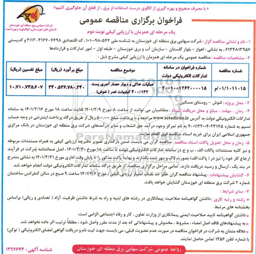 | م/01/1011015 | 2001001262000015 | عملیات خاکی و دیوار حصار آجری پست 400/132 کیلوولت نصر (شوش) | 340.536.780.340 | 10.710.735.607 |
