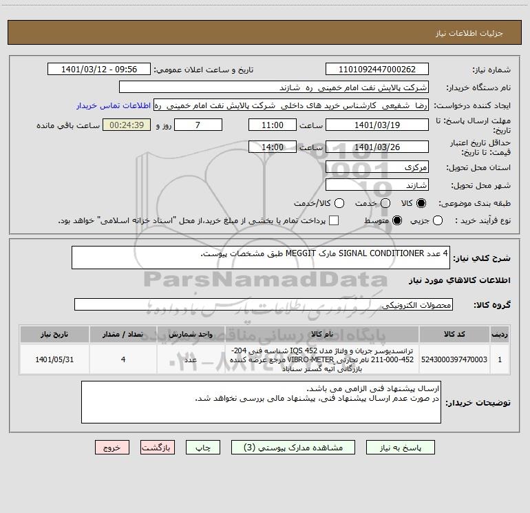 شرح کلی نیاز: 4 عدد SIGNAL CONDITIONER مارک MEGGIT طبق مشخصات پیوست.
