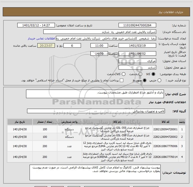 شرح کلی نیاز: باتری و آداپتور چراغ اضطراری طبق مشخصات پیوست.