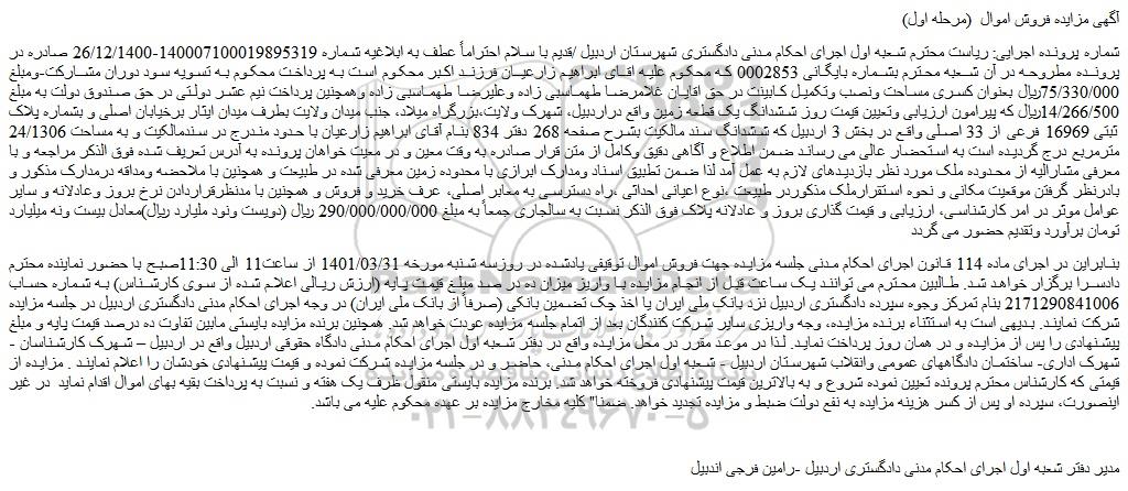 شعبه صادر کننده:شعبه اول اجرای احکام مدنی دادگستری شهرستان اردبیل/قدیم