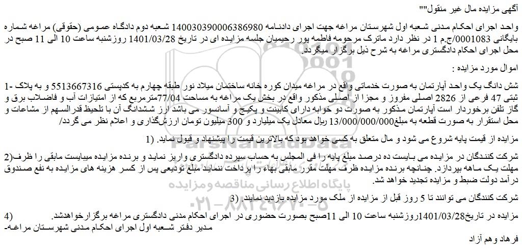 واحد اجرای احکام مدنی شعبه اول شهرستان مراغه جهت اجرای دادنامه 140030390006386980 شعبه دوم دادگاه عمومی (حقوقی) مراغه شماره بایگانی 0001083/ج.م 1 در نظر دارد ماترک مرحومه فاطمه پور رحیمیان جلسه مزایده ای در تاریخ 1401/03/28 روزشنبه ساعت 10 الی 11 صبح در محل اجرای احکام دادگستری مراغه به شرح ذیل برگزار میگردد.