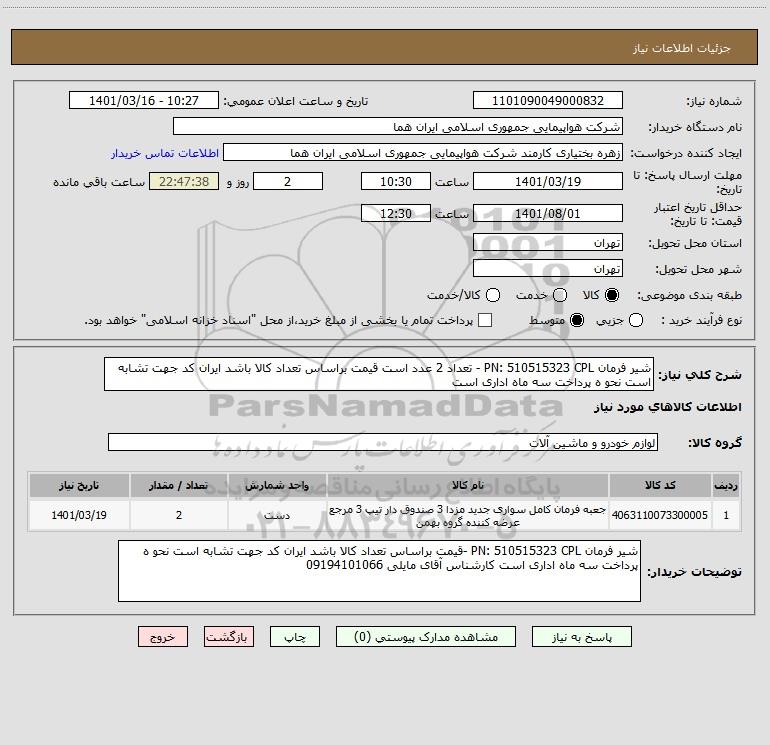 شرح کلی نیاز: شیر فرمان PN: 510515323 CPL - تعداد 2 عدد است قیمت براساس تعداد کالا باشد ایران کد جهت تشابه است نحو ه پرداخت سه ماه اداری است