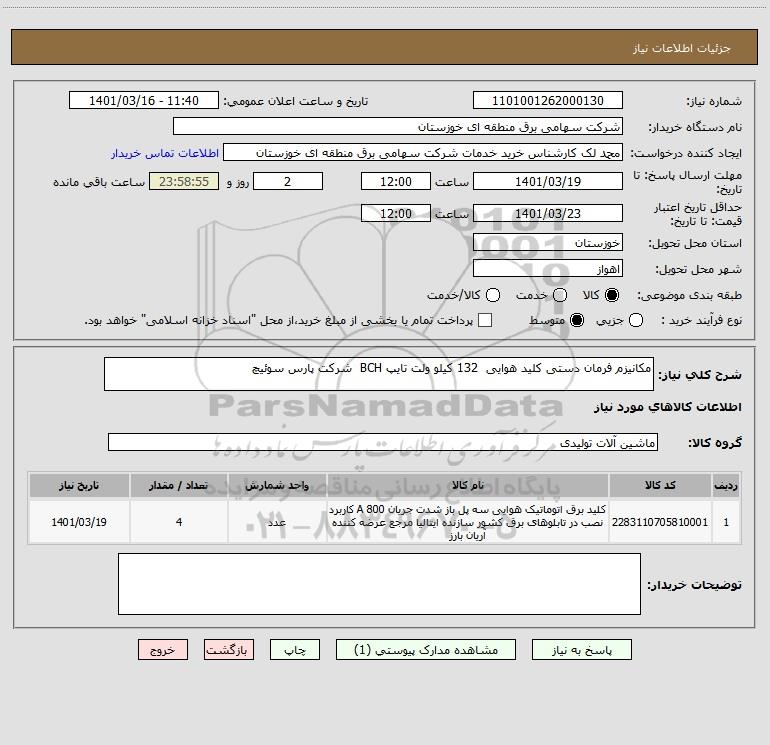 شرح کلی نیاز: مکانیزم فرمان دستی کلید هوایی 132 کیلو ولت تایپ BCH شرکت پارس سوئیچ