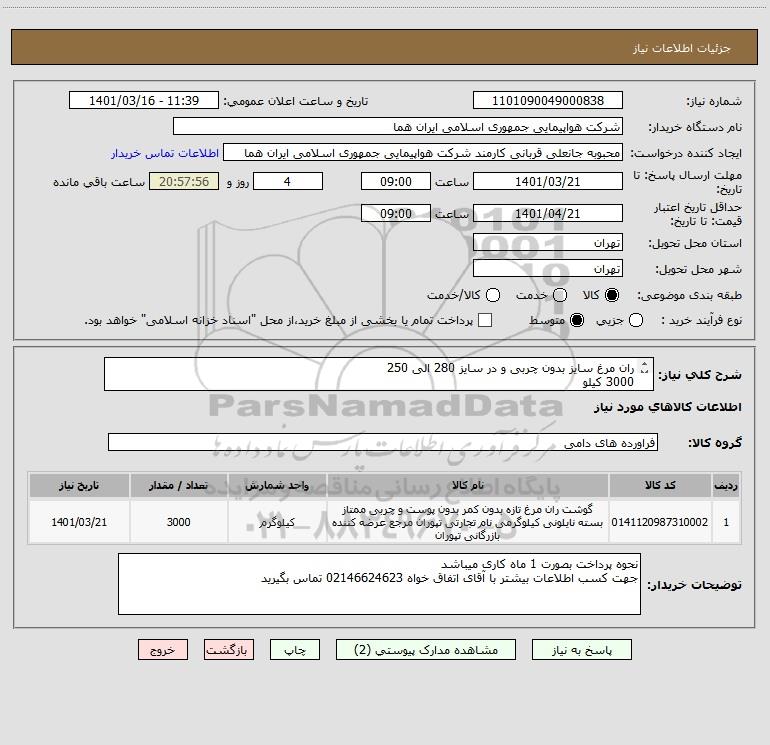 شرح کلی نیاز: ران مرغ سایز بدون چربی و در سایز 280 الی 250