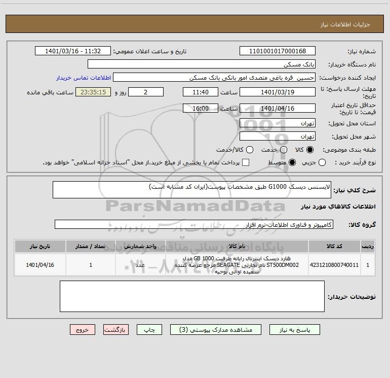 شرح کلی نیاز: لایسنس دیسک G1000 طبق مشخصات پیوست(ایران کد مشابه است)