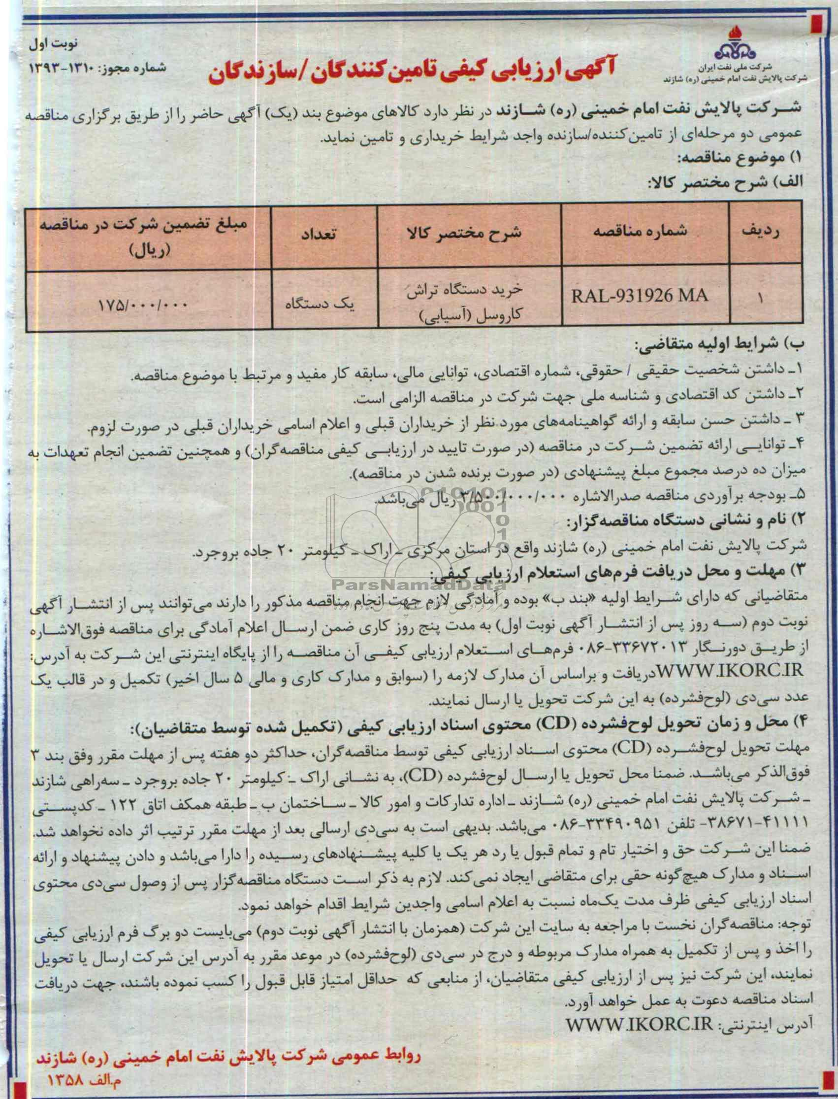 مناقصه خرید دستگاه تراش کاروسل , آگهی ارزیابی کیفی تامین کنندگان , مناقصه خرید دستگاه تراش کاروسل