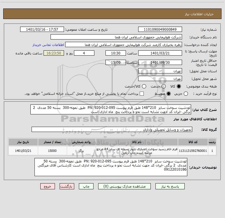 استعلام لودشیت سوخت سایز 210*148 طبق فرم پیوست PN: 920-012-095 طبق نمونه-300 بسته 50 عددی 2 برگی -ایران کد جهت تشابه است نحو ه پرداخت پنج ماه اداری است, استعلام لودشیت سوخت سایز 210*148 طبق فرم پیوست PN: 920-012-095 طبق نمونه-300 بسته 50 عددی 2 برگی -ایران کد جهت تشابه است نحو ه پرداخت پنج ماه اداری است