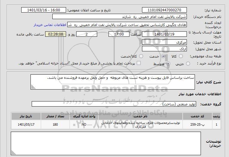 شرح کلی نیاز: ساخت براساس فایل پیوست و هزینه تست های مربوطه و حمل ونقل برعهده فروشنده می باشد.