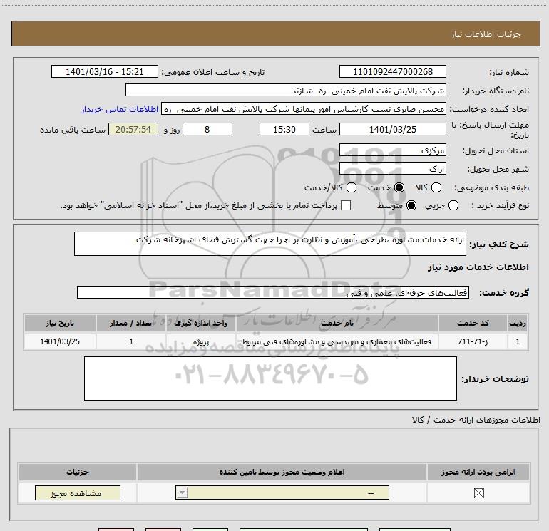 شرح کلی نیاز: ارائه خدمات مشاوره ،طراحی ،آموزش و نظارت بر اجرا جهت گسترش فضای اشپزخانه شرکت