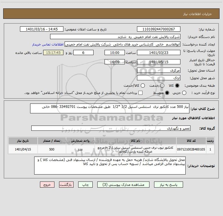 شرح کلی نیاز: نیاز 500 عدد کانکتور نری استنلس استیل 1/2 *1/2 طبق مشخصات پیوست 33492701 -086 خانی