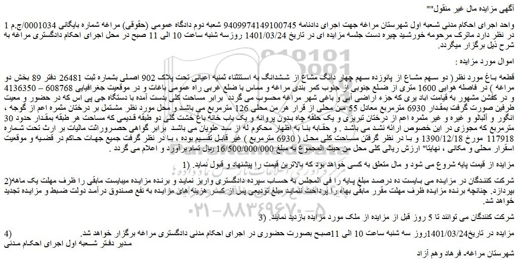 واحد اجرای احکام مدنی شعبه اول شهرستان مراغه جهت اجرای دادنامه 9409974149100745 شعبه دوم دادگاه عمومی (حقوقی) مراغه شماره بایگانی 0001034/ج.م 1 در نظر دارد ماترک مرحومه خورشید چیره دست جلسه مزایده ای در تاریخ 1401/03/24 روزسه شنبه ساعت 10 الی 11 صبح در محل اجرای احکام دادگستری مراغه به شرح ذیل برگزار میگردد.