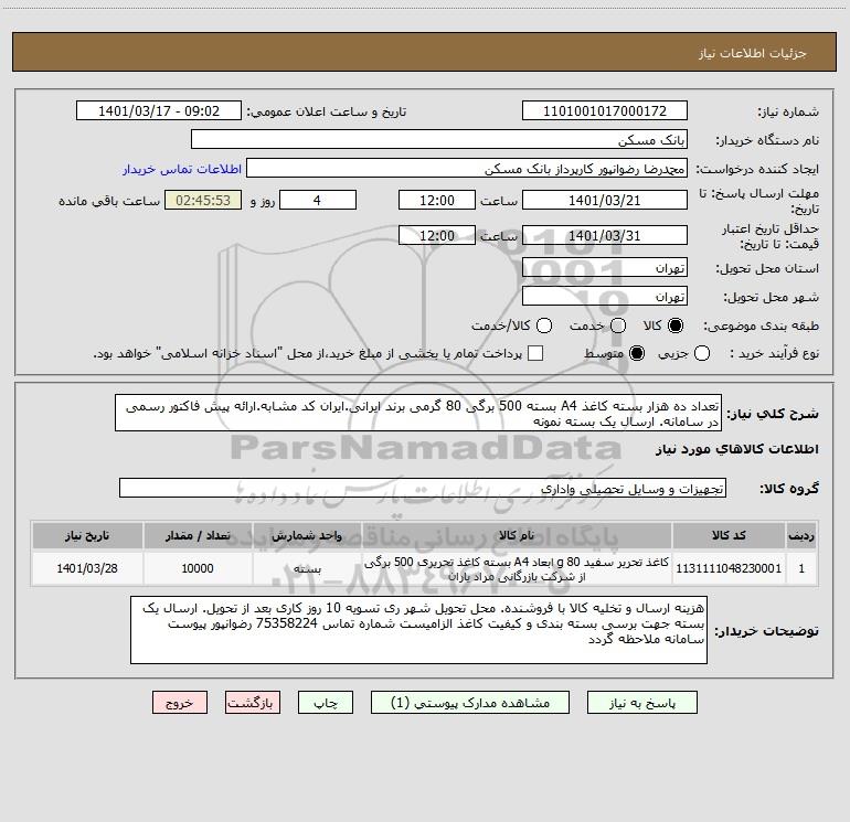 شرح کلی نیاز: تعداد ده هزار بسته کاغذ A4 بسته 500 برگی 80 گرمی برند ایرانی.ایران کد مشابه.ارائه پیش فاکتور رسمی در سامانه. ارسال یک بسته نمونه