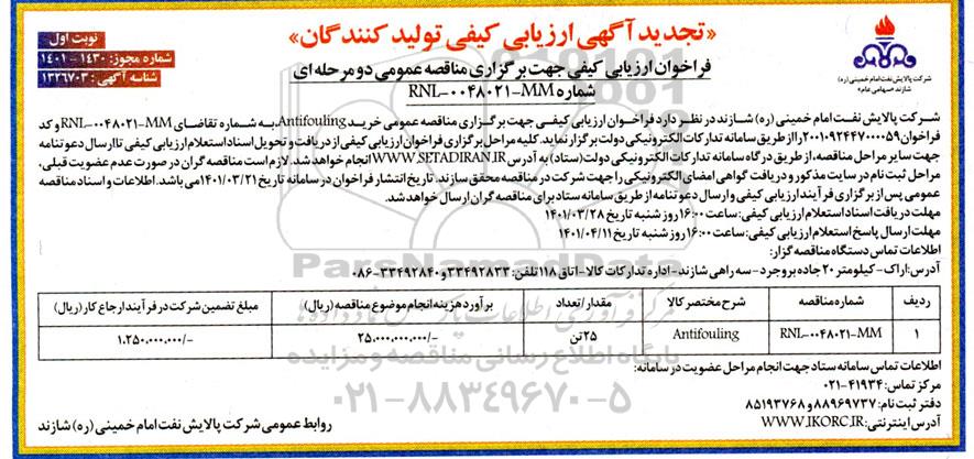شرکت پالایش نفت امام خمینی (ره) شازند در نظر دارد فراخوان ارزیابی کیفی جهت برگزاری مناقصه عمومی خرید Antifouling به شماره تقاضای RNL-0048021-MM و کد فراخوان 2001092447000059