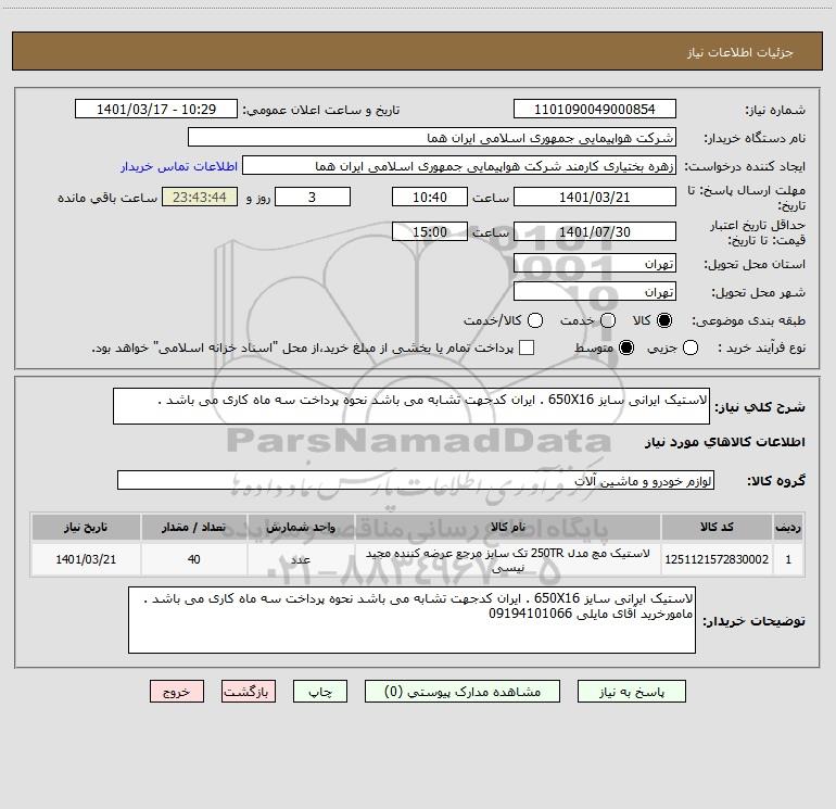 شرح کلی نیاز: لاستیک ایرانی سایز 650X16 . ایران کدجهت تشابه می باشد نحوه پرداخت سه ماه کاری می باشد .