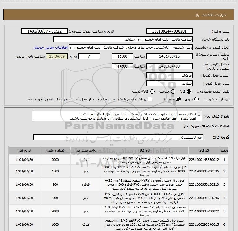 شرح کلی نیاز: 9 قلم سیم و کابل طبق مشخصات پیوست. مقدار مورد نیاز به متر می باشد.