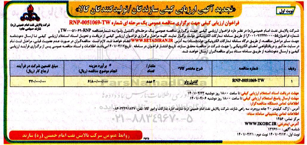 شرکت پالایش نفت امام خمینی (ره) در نظر دارد فراخوان ارزیابی کیفی جهت برگزاری مناقصه عمومی یک مرحله ای (کنترل ولو) به شماره مناقصه RNP-0051069 -TW) و شماره فراخوان 2001092447000055 را از طریق سامانه تدارکات الکترونیکی دولت برگزار نماید کلیه مراحل برگزاری فراخوان ارزیابی کیفی از دریافت و تحویل اسناد استعلام ارزیابی کیفی تا ارسال دعوت نامه جهت سایر مراحل مناقصه از طریق درگاه سامانه تدارکات الکترونیکی دولت ستاد به آدرس ستاد ایران انجام خواهد شد لازم است مناقصه گران در صورت عدم عضویت قبلی مراحل ثبت نام در سایت مذکور و دریافت گواهی امضای الکترونیکی را جهت شرکت در مناقصه محقق سازند تاریخ انتشار فراخوان در سامانه تاریخ 1401.3.17 می باشد. اطلاعات و اسناد مناقصه عمومی پس از برگزاری فرایند ارزیابی کیفی و ارسال دعوتنامه از طریق سامانه ستاد به مناقصه گران ارسال خواهد شد