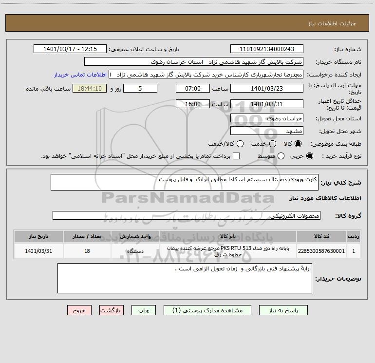 نام دستگاه خریدار:شرکت پالایش گاز شهید هاشمی نژاد استان خراسان رضوی