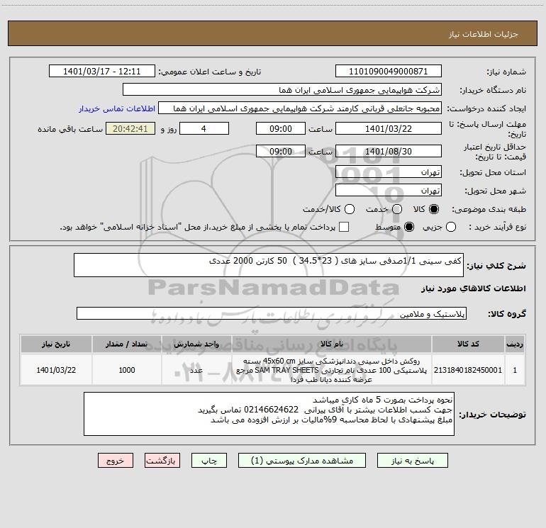 شرح کلی نیاز: کفی سینی 1/1صدفی سایز های ( 23*34.5 ) 50 کارتن 2000 عددی