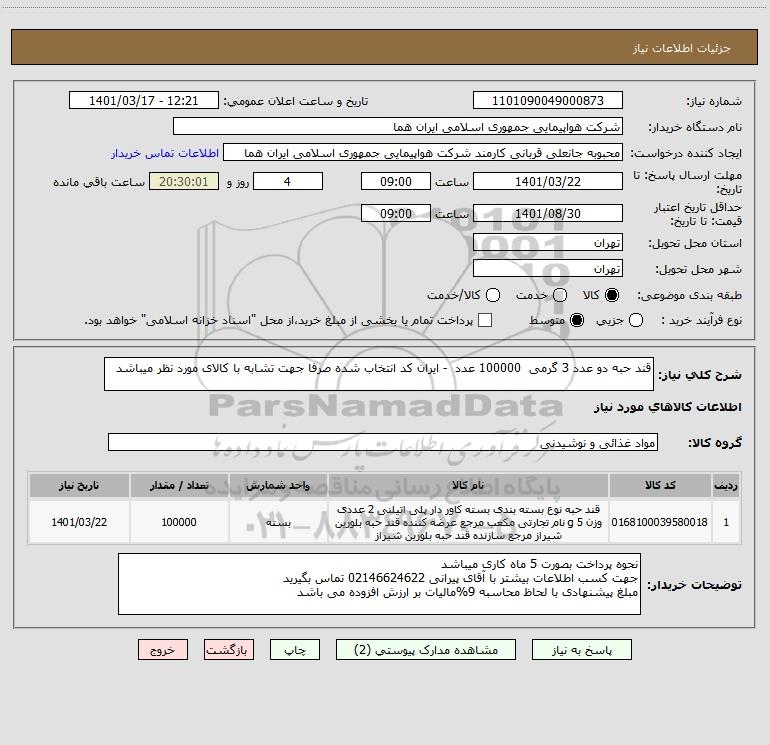 شرح کلی نیاز: قند حبه دو عدد 3 گرمی 100000 عدد - ایران کد انتخاب شده صرفا جهت تشابه با کالای مورد نظر میباشد