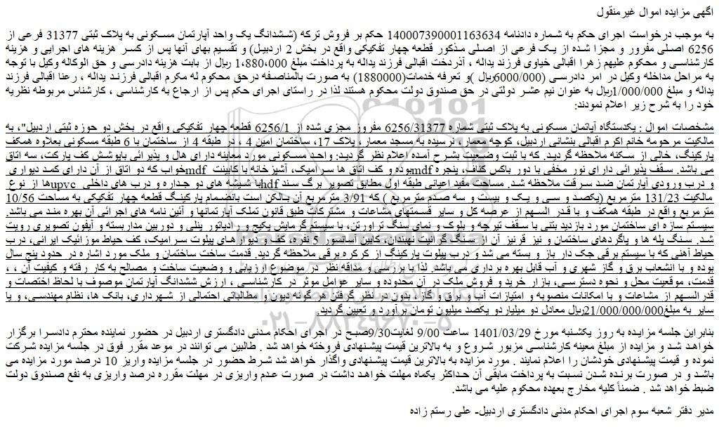 به موجب درخواست اجرای حکم به شماره دادنامه 140007390001163634 حکم بر فروش ترکه (ششدانگ یک واحد آپارتمان مسکونی به پلاک ثبتی 31377 فرعی از 6256 اصلی مفرور و مجزا شده از یک فرعی از اصلی مذکور قطعه چهار تفکیکی واقع در بخش 2 اردبیل) و تقسیم بهای آنها پس از کسر هزینه های اجرایی و هزینه کارشناسی و محکوم علیهم زهرا اقبالی خیاوی فرزند یداله ، آذردخت اقبالی فرزند یداله به پرداخت مبلغ 1،880،000 ریال از بابت هزینه دادرسی و حق الوکاله وکیل با توجه به مراحل مداخله وکیل در امر دادرسی (6000/000ریال )و تعرفه خدمات(1880000) به صورت بالمناصفه درحق محکوم له مکرم اقبالی فرزند یداله ، رعنا اقبالی فرزند یداله و مبلغ 1/000/000ریال به عنوان نیم عشر دولتی در حق صندوق دولت محکوم هستند لذا در راستای اجرای حکم پس از ارجاع به کارشناسی ، کارشناس مربوطه نظریه خود را به شرح زیر اعلام نمودند: