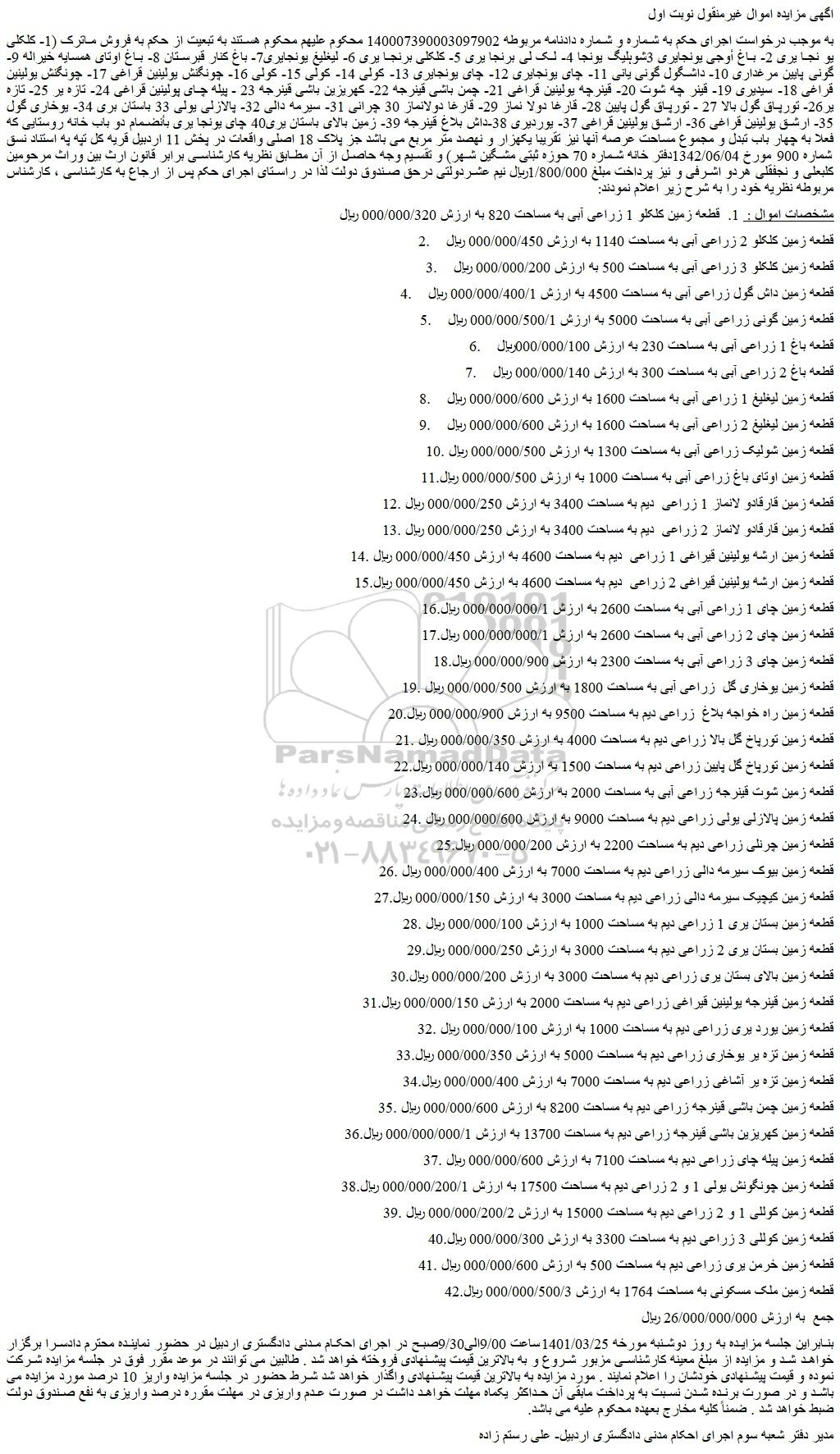 به موجب درخواست اجرای حکم به شماره و شماره دادنامه مربوطه 140007390003097902 محکوم علیهم محکوم هستند به تبعیت از حکم به فروش ماترک (1- کلکلی یو نجا یری 2- باغ أوجی یونجایری 3شوہلیگ یونجا 4- لک لی برنجا یری 5- کلکلی برنجا یری 6- لیغلیغ یونجایری7- باغ کنار قبرستان 8- باغ اوتای همسایه خیراله 9- گونی پایین مرغداری 10- داشگول گونی یانی 11- چای یونجایری 12- چای یونجایری 13- کولی 14- کولی 15- کولی 16- چونگنش یولینین قراغی 17- چونگنش یولینین قراغى 18- سیدیری 19- قینر چه شوت 20- قینرچه یولینین قراغی 21- چمن باشی قینرجه 22- کهریزین باشی قینرجه 23 - پیله چای پولینین قراغی 24- تازه یر 25- تازه یر26- تورپاق گول بالا 27 - تورپاق گول پایین 28- قارغا دولا نماز 29- قارغا دولانماز 30 چرانی 31- سیرمه دالی 32- پالازلی یولی 33 باستان بری 34- یوخاری گول 35- ارشق یولینین قراغی 36- ارشق یولینین قراغی 37- یوردیری 38-داش بلاغ قینرجه 39- زمین بالای باستان یری40 چای یونجا یرى بأنضمام دو باب خانه روستایی که فعلا به چهار باب تبدل و مجموع مساحت عرصه آنها نیز تقریبا یکهزار و نهصد متر مربع می باشد جز پلاک 18 اصلی واقعات در پخش 11 اردبیل قریه کل تپه په استناد نسق شماره 900 مورخ 1342/06/04دفتر خانه شماره 70 حوزه ثبتی مشگین شهر) و تقسیم وجه حاصل از آن مطابق نظریه کارشناسی برابر قانون ارث بین وراث مرحومین کلبعلی و نجفقلی هردو اشرفی و نیز پرداخت مبلغ 1/800/000ریال نیم عشردولتی درحق صندوق دولت لذا در راستای اجرای حکم پس از ارجاع به کارشناسی ، کارشناس مربوطه نظریه خود را به شرح زیر اعلام نمودند: