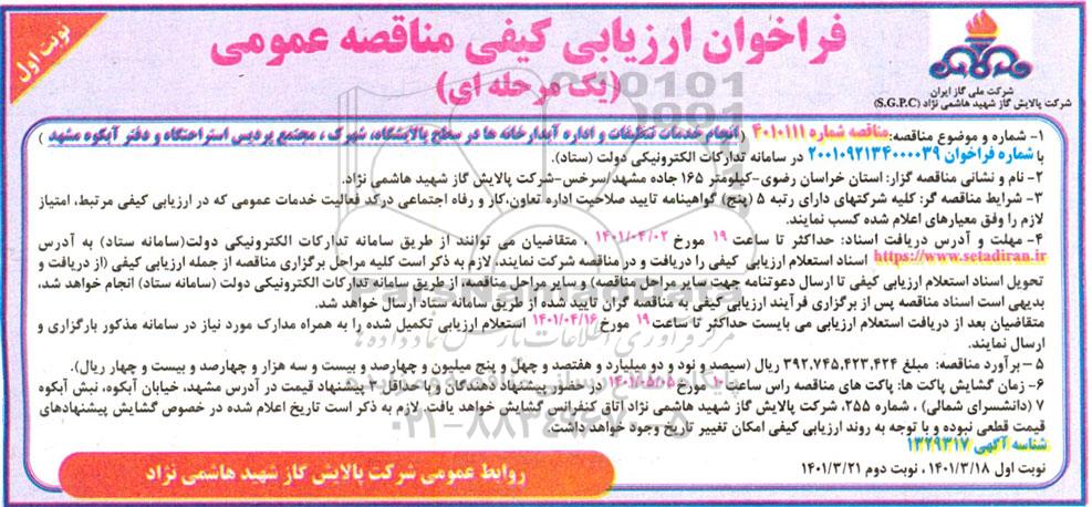 شماره موضوع مناقصه: مناقصه شماره 4010111 (انجام خدمات تنظیفات و اداره آبدارخانه ها در سطح پالایشگاه، شهرک، مجتمع پردیس استراحتگاه و دفتر آبکوه مشهد) با شماره فراخوان 2001092134000039 در سامانه تدارکات الکترونیکی دولت ستاد
