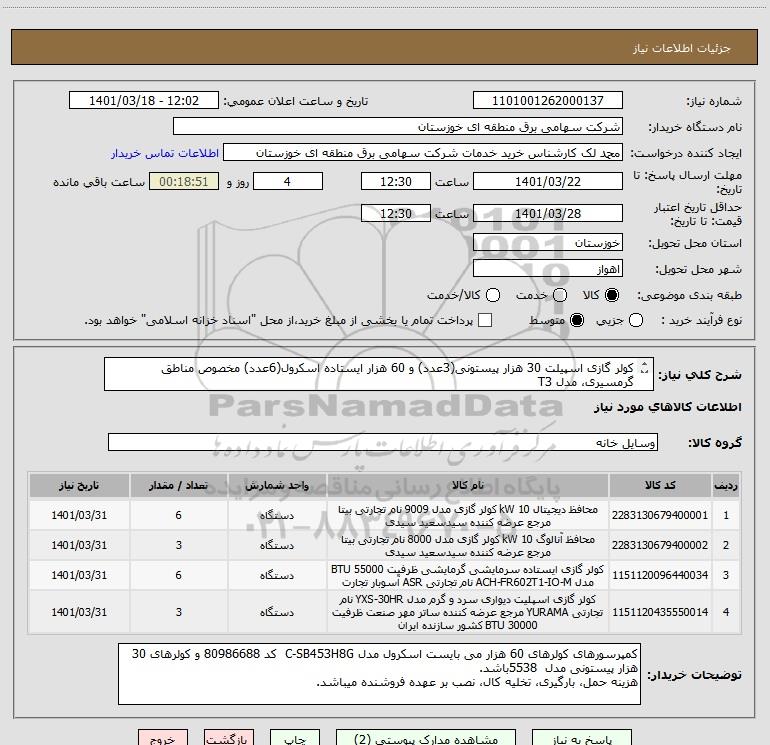 استعلام کولر گازی اسپیلت 30 هزار پیستونی(3عدد) و 60 هزار ایستاده اسکرول(6عدد) مخصوص مناطق گرمسیری، مدل T3 محافظ برقی مخصوص کولر 30 و 60هزار (مطابق پیوست), استعلام کولر گازی اسپیلت 30 هزار پیستونی(3عدد) و 60 هزار ایستاده اسکرول(6عدد) مخصوص مناطق گرمسیری، مدل T3 محافظ برقی مخصوص کولر 30 و 60هزار (مطابق پیوست)