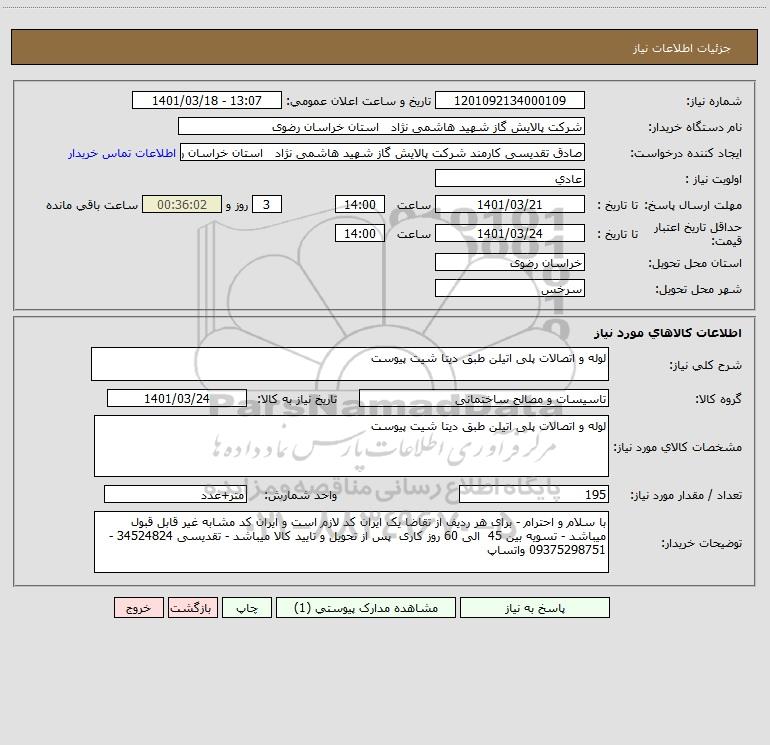 نام دستگاه خریدار:شرکت پالایش گاز شهید هاشمی نژاد استان خراسان رضوی