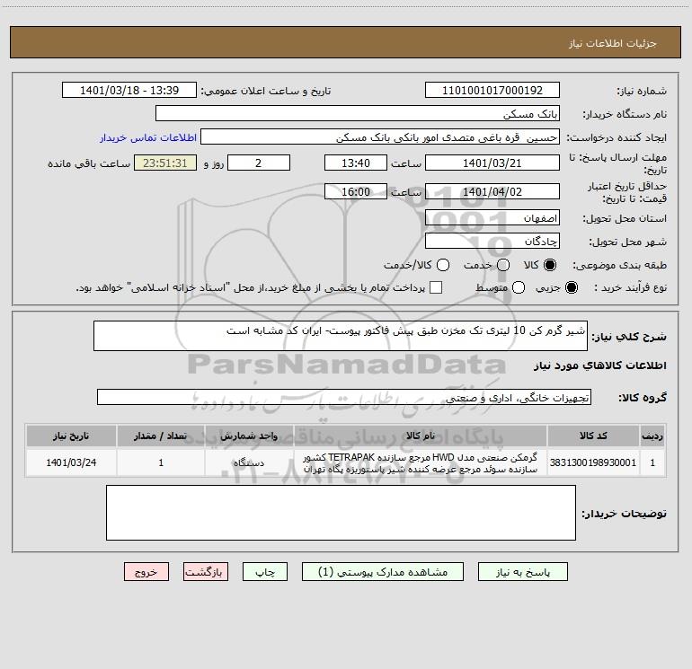 شرح کلی نیاز: شیر گرم کن 10 لیتری تک مخزن طبق پیش فاکتور پیوست- ایران کد مشابه است