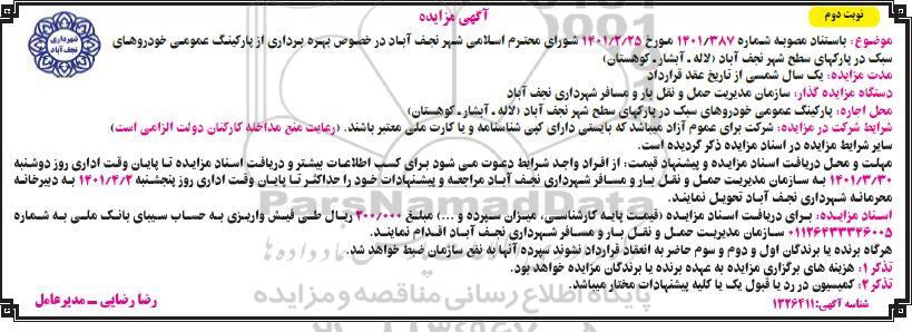 موضوع: در خصوص بهره برداری از پارکینگ عمومی خودروهای سبک در پارکهای سطح شهر نجف آباد (لاله، آبشار، کوهستان)