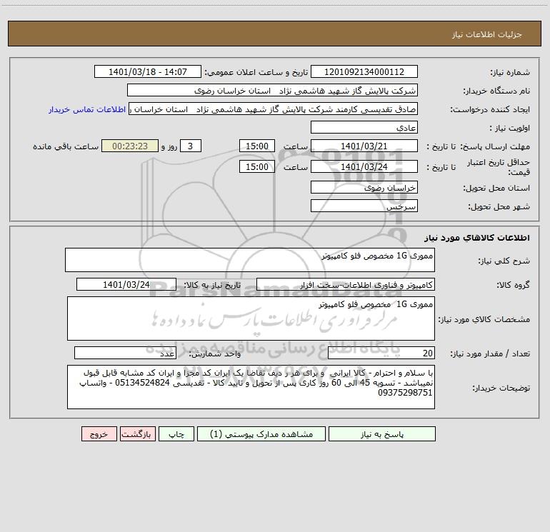 نام دستگاه خریدار:شرکت پالایش گاز شهید هاشمی نژاد استان خراسان رضوی