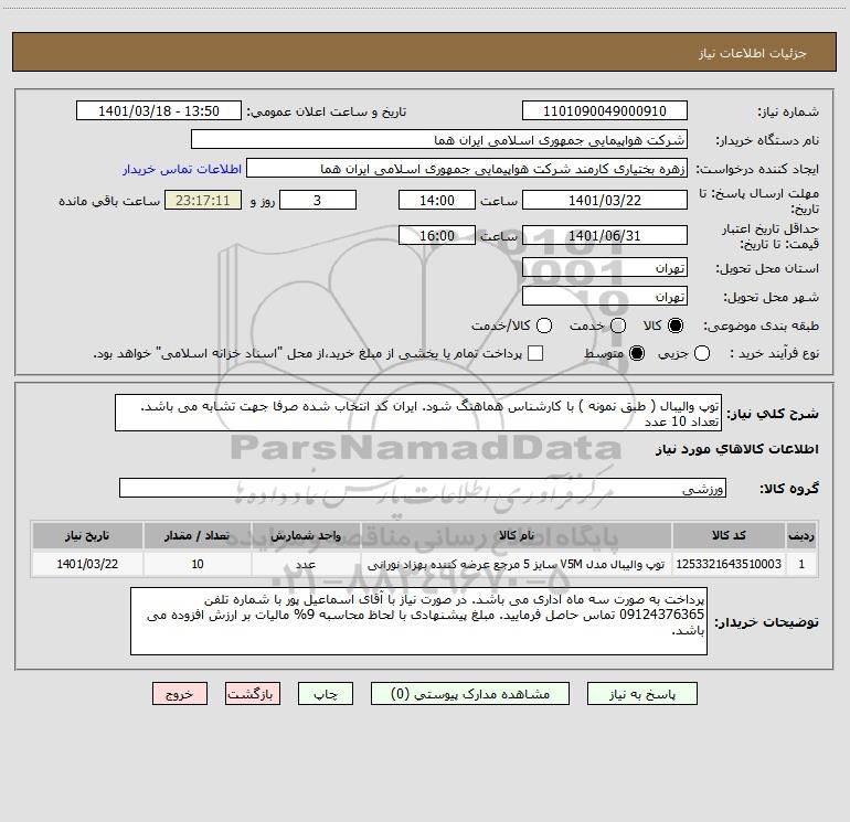 شرح کلی نیاز: توپ والیبال ( طبق نمونه ) با کارشناس هماهنگ شود. ایران کد انتخاب شده صرفا جهت تشابه می باشد. تعداد 10 عدد