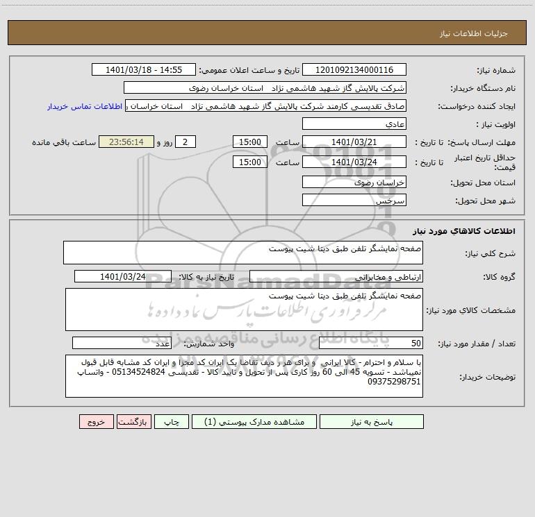 نام دستگاه خریدار:شرکت پالایش گاز شهید هاشمی نژاد استان خراسان رضوی