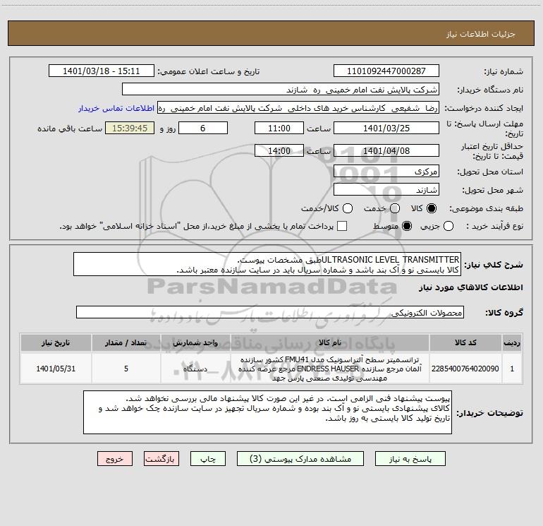 شرح کلی نیاز: ULTRASONIC LEVEL TRANSMITTERطبق مشخصات پیوست.