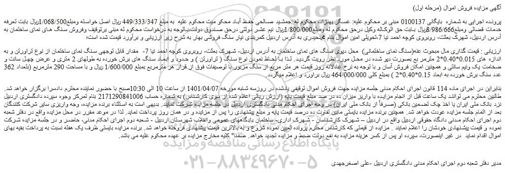 پرونده اجرایی به شماره بایگانی 0100137 مبنی بر محکوم علیه: عسگر بهنژاد، محکوم له :جمشید صالحی حفظ آباد محکو میت محکوم علیه به مبلغ 449/333/347 ریال اصل خواسته ومبلغ1/068/500ریال بابت تعرفه خدمات قضائی ومبلغ8/986/666ریال بابت حق الوکاله وکیل درحق محکوم له ومبلغ1/800/000ریال نیم عشر دولتی درحق صندوق دولت،باتوجه به درخواست محکوم له مبنی برتوقیف وفروش سنگ های نمای ساختمان به آدرس اردبیل- شهرک بعثت- روبروی کوچه احمد نیا 7،تحویلی امین اموال بنام محمدحیدری به آدرس اردبیل کمربندی نیار سنگ فروشی بهار به شرح زیر ارزیابی و برآورد قیمت شده است؛