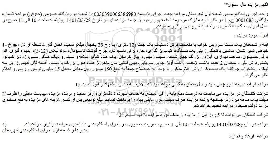 واحد اجرای احکام مدنی شعبه اول شهرستان مراغه جهت اجرای دادنامه 140030390006386980 شعبه دوم دادگاه عمومی (حقوقی) مراغه شماره بایگانی 0001083 ج.م 1 در نظر دارد ماترک مرحومه فاطمه پور رحیمیان جلسه مزایده ای در تاریخ 1401/03/28 روزشنبه ساعت 10 الی 11 صبح در محل اجرای احکام دادگستری مراغه به شرح ذیل برگزار میگردد.