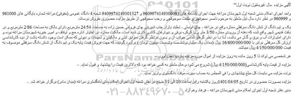 - مزایده بصورت حضوری در تاریخ 1401/04/05روز یکشنبه راس ساعت 10 الی 11 صبح در دفتر شعبه اول اجرای احکام مدنی دادگستری مراغه (میدان مادر) برگزار خواهد شد.