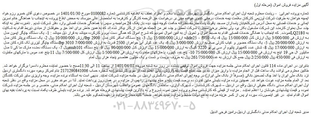 شماره پرونده اجرایی: - ریاست محترم شعبه اول اجرای احکام مدنی دادگستری شهرستان اردبیل با سلام و احترام عطف به ابلاغیه کارشناسی شماره 0100082 مورخ 1401/01/30 در خصوص دعوی آقای خسرو رزم خواه ایمچه خواهان به طرفیت شرکت توزیعی کارکنان سلامت بیمه خدمات درمانی کشور خوانده مبنی بر درخواست حق الزحمه کارگر و کارفرما به استحضار عالی میرساند به محض ابلاغ پرونده به اینجانب با هماهنگی خانم نسرین ایمانی و خدمات قضایی به محل آدرس شرکتخیابان پاسداران مسجد یاقوت پشت مدرسه دخترانه حکمت کوچه شهید دیده بان پلاک 24 مراجعه و سپس با هماهنگی خدمات قضایی وارد دفتر شرکت شدیم . نامبرده نظر به اینکه چند سال بعنوان کارمند این شرکت مشغول بکار بود ولی بخاطر برخی مسایل ، شرکت تعطیل و چند نفر من الجمله خواهان از کار بیکار شده اند که به همین خاطر برای اخذ حق و حقوقشان از مبادی ذیربط اقدام به شکایت نمودند. که اینجانب با همانگی خدمات قضایی اقدام به ضبط اموال و تحویل آن به امین اموال نمودیم که شرح اموال که همگی دست دوم و کارکرده میباشد به قرار ذیل میباشد : 1- یک دستگاه چاپگر اپسون مدل LQ2180 به ارزش 10/000/000 ریال 2- یک دستگاه پرینتر کانن مدل lbp 2900 به ارزش 15/000/000 ریال 3- پنج دستگاه اسکنر کانن مدل lide25 - f910 به ارزش فی 3/000/000 ریال ارزش کل 15/000/000 ریال 4- یک دستگاه چاپگر لیزری تک کاره کانن مدل lbp 3010 به ارزش 20/000/000 ریال 5- یک دستگاه حضور و غیاب کارتی صلا به ارزش 3/000/000 ریال 6- یک عدد کولر آبی جواهران 2500 قدرت به ارزش 7/000/000 ریال 7- یک دستگاه دمنده مارک ما کی تا مدل mub101 به ارزش 17/000/000 ریال 8- شش عدد کامپیوتر پنتیوم آر سی پی یو 3220 گیگ به ارزش 15/000/000 ریال ارزش کل 90/000/000 ریال 9- پنج دستگاه مانیتور ال جی 19 اینج به ارزش فی 15/000/000 ریال ارزش کل 75/000/000 10- پنج عدد کیبورد با مارکهای متفاوت به ارزش فی 1/500/000 ریال ارزش کل 7/500/000 ریال 11-پنج عدد موس با مارکهای متفاوت به ارزش فی 450/000 ریال 2/250/000 ریال جمع کل ارزش به عدد261/750/000 ریال به حروف دویست و شست و یک میلیون هفتصدو پنجاه هزار ریال تمام