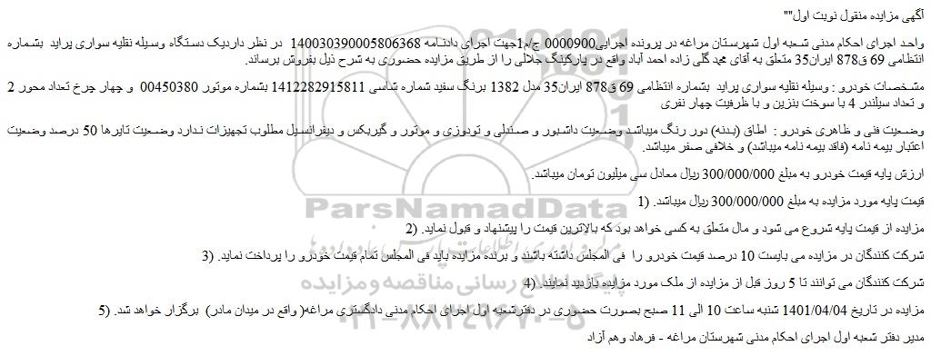واحد اجرای احکام مدنی شعبه اول شهرستان مراغه در پرونده اجرایی0000900 ج/م1جهت اجرای دادنامه 140030390005806368 در نظر داردیک دستگاه وسیله نقلیه سواری پراید بشماره انتظامی 69 ق878 ایران35 متعلق به آقای محمد گلی زاده احمد آباد واقع در پارکینگ جلالی را از طریق مزایده حضوری به شرح ذیل بفروش برساند.