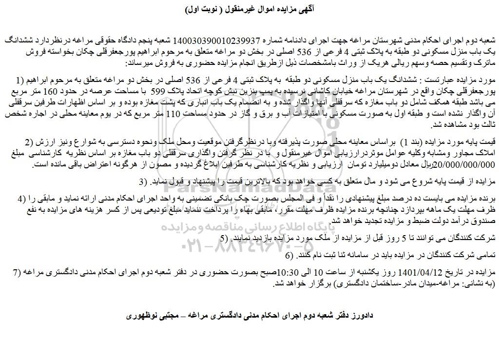 شعبه دوم اجرای احکام مدنی شهرستان مراغه جهت اجرای دادنامه شماره 140030390010239937 شعبه پنجم دادگاه حقوقی مراغه درنظردارد ششدانگ یک باب منزل مسکونی دو طبقه به پلاک ثبتی 4 فرعی از 536 اصلی در بخش دو مراغه متعلق به مرحوم ابراهیم پورجعفرقلی چکان بخواسته فروش ماترک وتقسیم حصه وسهم ریالی هریک از وراث بامشخصات ذیل ازطریق انجام مزایده حضوری به فروش میرساند:
