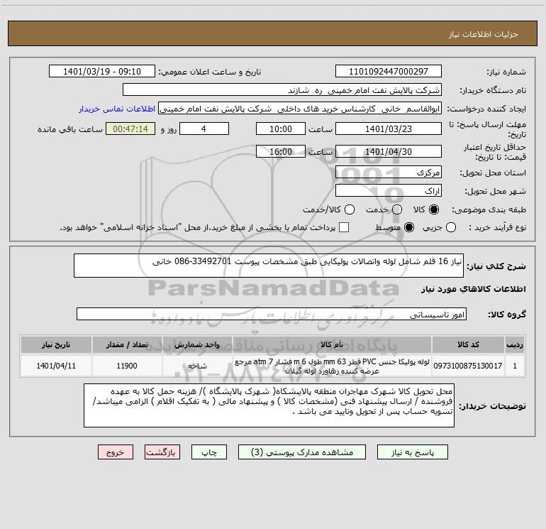شرح کلی نیاز: نیاز 16 قلم شامل لوله واتصالات پولیکایی طبق مشخصات پیوست 33492701-086 خانی