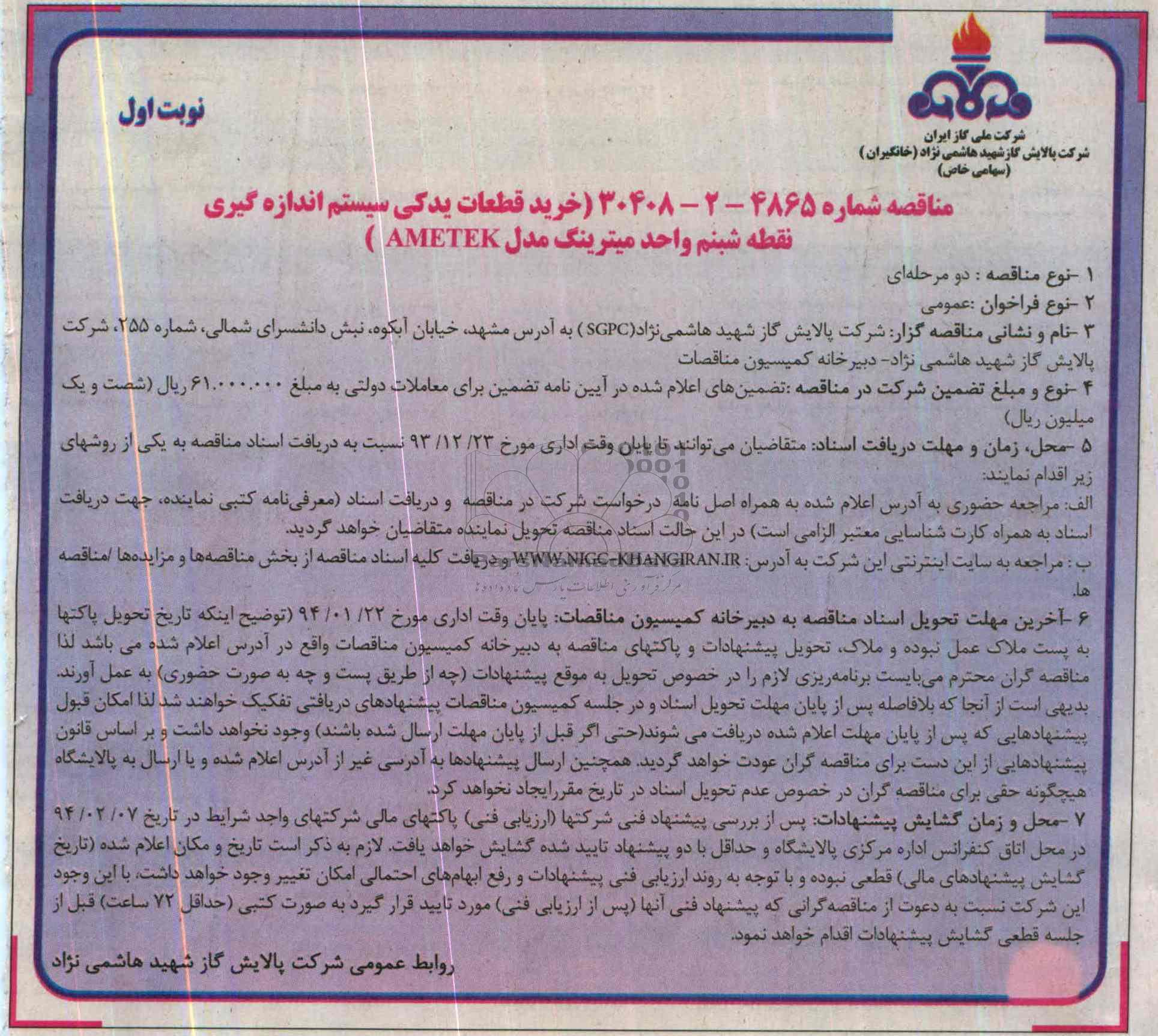 به آدرس مشهد خیابان آبکوه نبش دانشسرای شمالی شماره 255 شرکت پالایش گاز شهید هاشمی نژاد دبیرخانه کمیسیون مناقصات