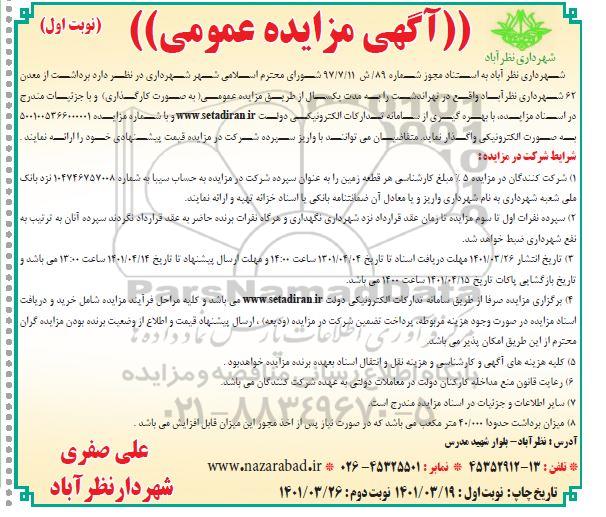 شهرداری نظرآباد در نظر دارد برداشت از معدن 62 شهرداری نظرآباد واقع در تهراندشت را به مدت یکسال از طریق مزایده عمومی به صورت کارگزاری و با جزییات مندرج در اسناد مزایده با بهره گیری از سامانه تدارکات الکترونیکی دولت و با شماره مزایده 5001005366000001 به صورت التکرونیکی واگذار نماید متقاضیان می توانند با واریز سپرده شرکت در مزایده قیمت پینشهادی خود را ارائه نمایند